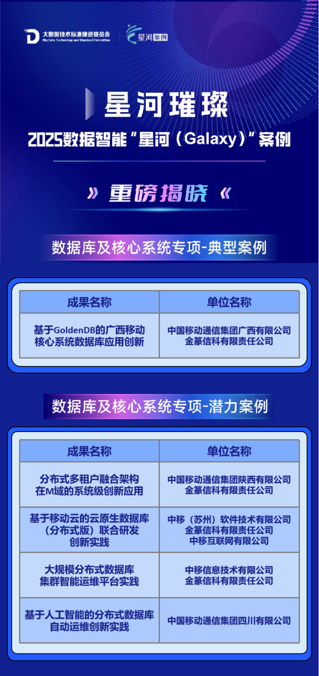 近日,由中国信息通信研究院联合中国通信标准化协会大数据技术标准推进委员会(CCSA TC601)共同组织的2025数据智能“星河(Galaxy)”案例名单正式公布。在这一代表中国数据智能领域高水平应用的权威评选中,中兴通讯GoldenDB成为本届入选案例数量最多的数据库厂商,充分彰显了在国产数据库应用领域的领先实力与深入实践。