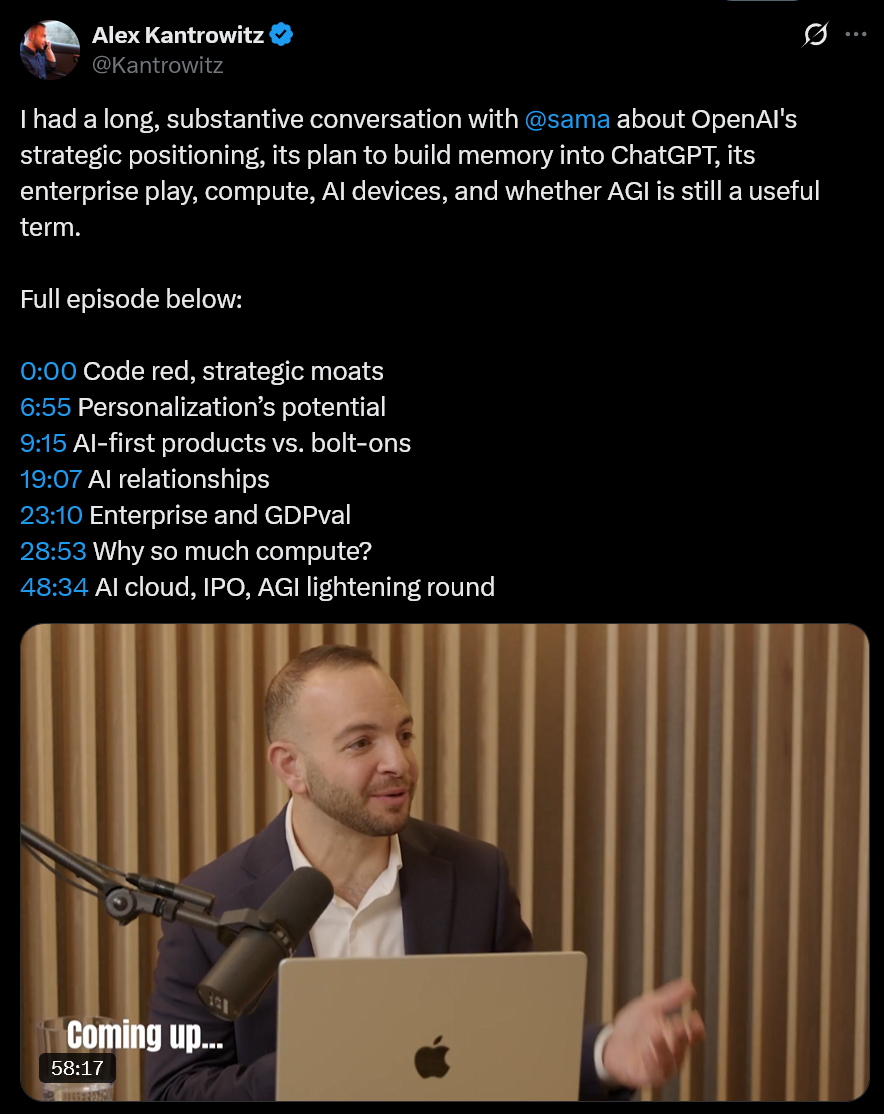 在这个名为《Big Technology Podcast》的播客中,奥尔特曼曝出不少金句。