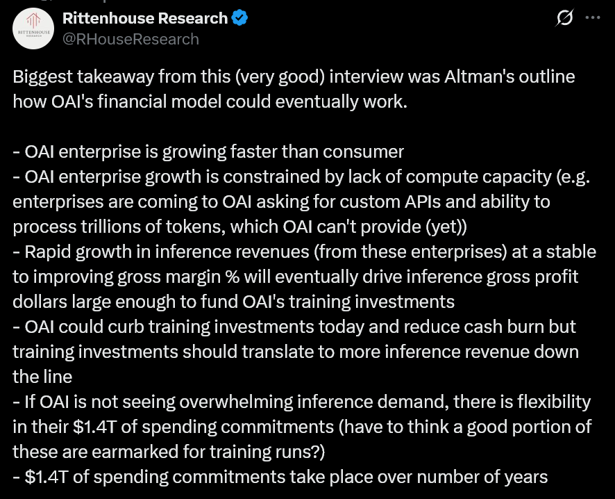 有人评论说,这次采访给人的最大收获,就是奥尔特曼终于讲清了 OpenAI 的财务模式到底是怎么运作的。