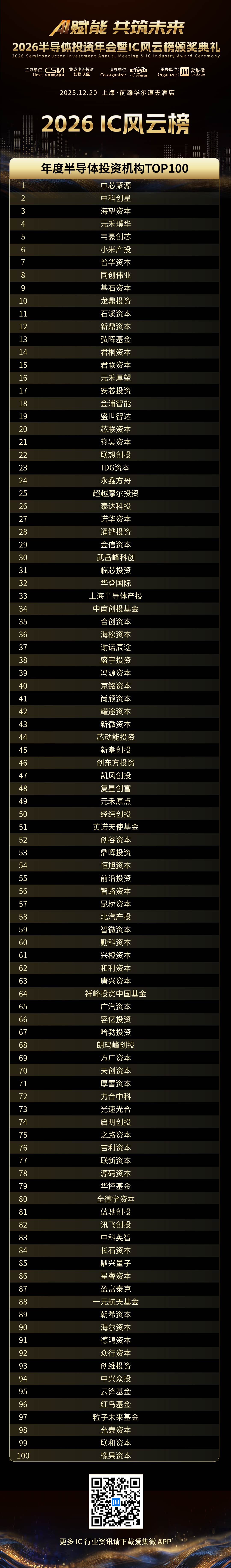 会上,还发布了包括年度半导体投资机构TOP100、年度最佳国资投资机构TOP30、年度最佳投资机构奖、年度最佳产业投资机构TOP20、年度最佳早期投资机构TOP20、年度最佳行业投资机构奖(AI类)、年度最佳行业投资机构奖(具身智能类)、年度最佳并购案例奖、年度最佳投资人TOP50、年度最佳投资人奖、年度最佳产业投资人奖、年度最佳早期投资人奖等多项重磅榜单及奖项,成为现场一大亮点。