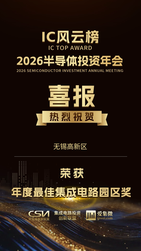 12月20日,由中国半导体投资联盟主办、爱集微承办的2026半导体投资年会暨IC风云榜颁奖典礼在上海举行。活动现场正式发布了《中国集成电路园区综合实力TOP30》无锡高新区位列全国第二,仅次于上海张江高科技园区。这是无锡高新区连续第四届蝉联此项殊荣。同时无锡高新区再度获评“年度最佳集成电路园区奖”。
