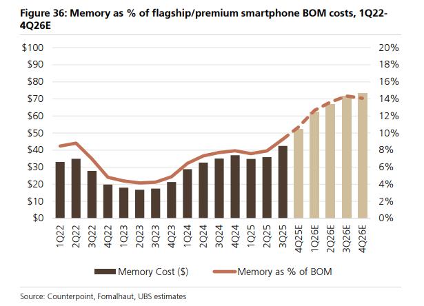 整个 2026 年手机价格都会笼罩在内存价格上涨带来的负面影响之下 | 图片来源:瑞银