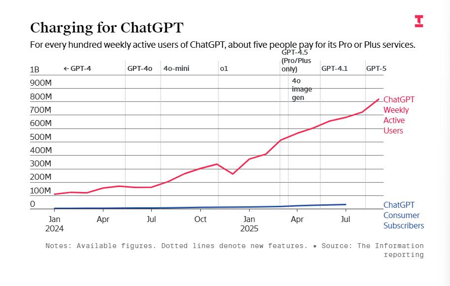 图:在每100名ChatGPT的周活跃用户中,约有5人付费订阅其Pro或Plus服务