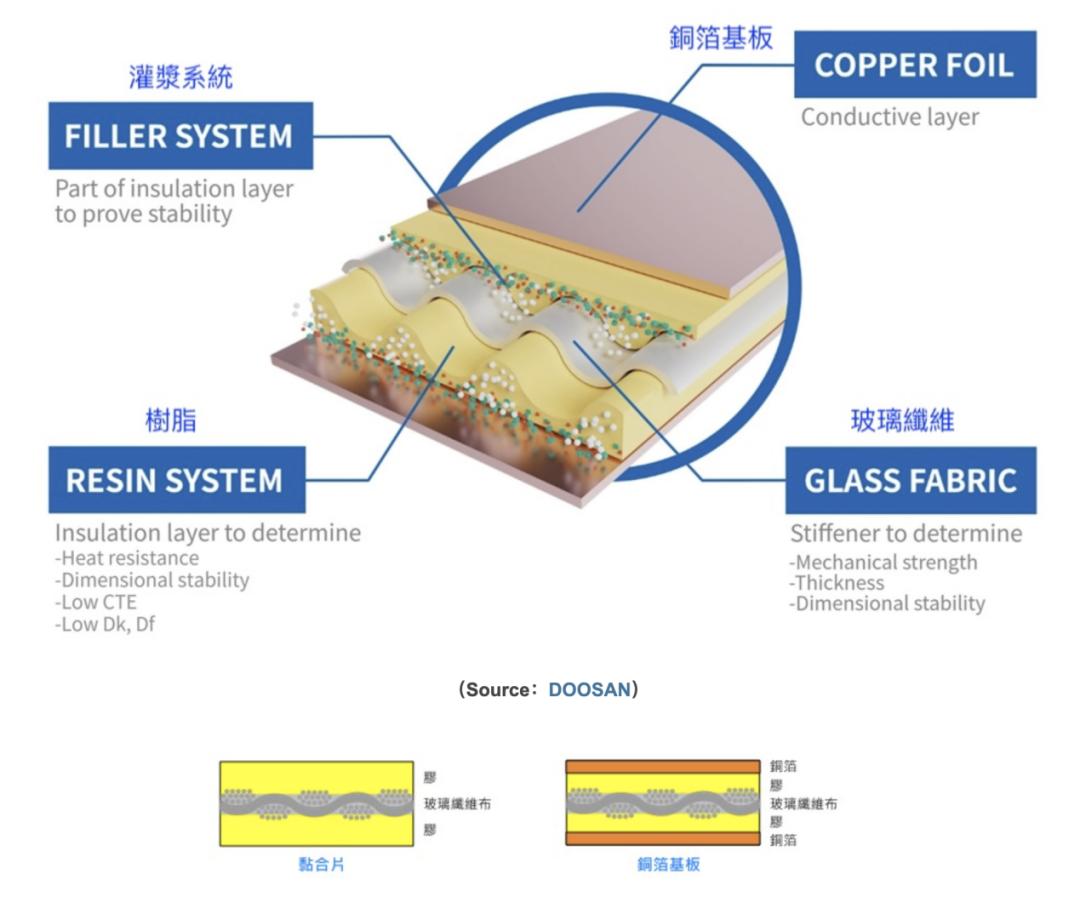其实除了T-Glass以外,根据玻璃纤维类型,还拥有 E-glass、A-glass、C-glass、D-glass、S-glass等多种纤维型态。其中,E-glass(电气级)属于高阶无碱玻璃纤维,具有良好的电绝缘性,可确保电气绝缘稳定;S-glass是高强度玻璃,具更高机械强度;C-glass特色是耐化学腐蚀玻璃,耐酸性佳。