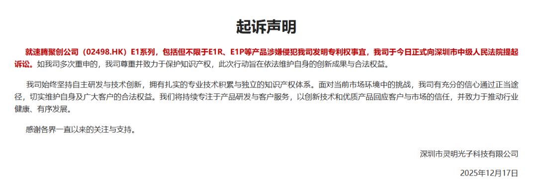 自证多日的灵明光子反将速腾聚创告上了法庭。其在官网发布《起诉声明》,称就速腾聚创E1系列,包括但不限于E1R、E1P等产品涉嫌侵犯其发明专利权事宜,已正式向深圳市中级人民法院提起诉讼。
