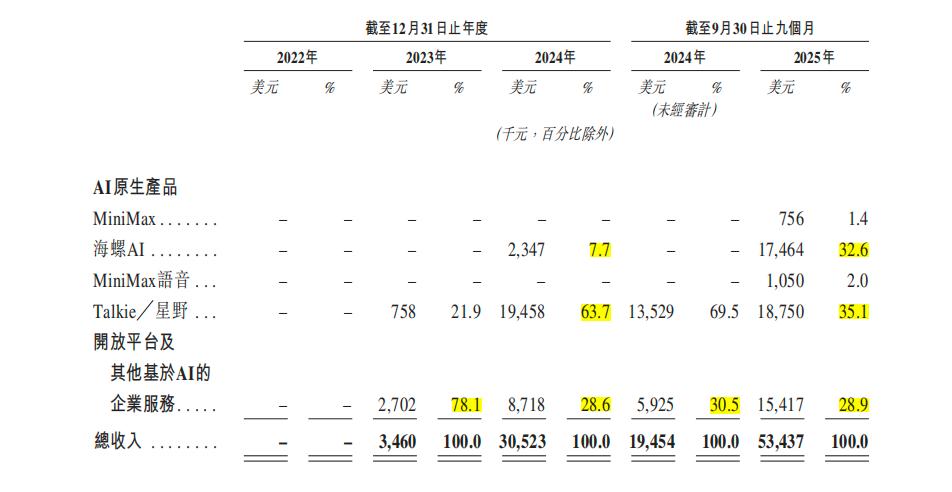 MiniMax的收入增长则主要依靠AI原生产品,其中海螺AI的重要性在提升——收入占比从2024年的7%上升到32.6%,而我们所熟知的Talkie╱星野占比从63.7%下降到了35.1%。