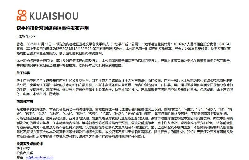 12月23日快手进一步公开回应称:“本公司始终严守合规底线,坚决反对任何违规内容及行为。本公司强烈谴责黑灰产的违法犯罪行为,已就上述事宜向公安机关报警并向相关部门报告,并将视情况采取其他适当的法律补救措施,以保障本公司及其股东的权益。”