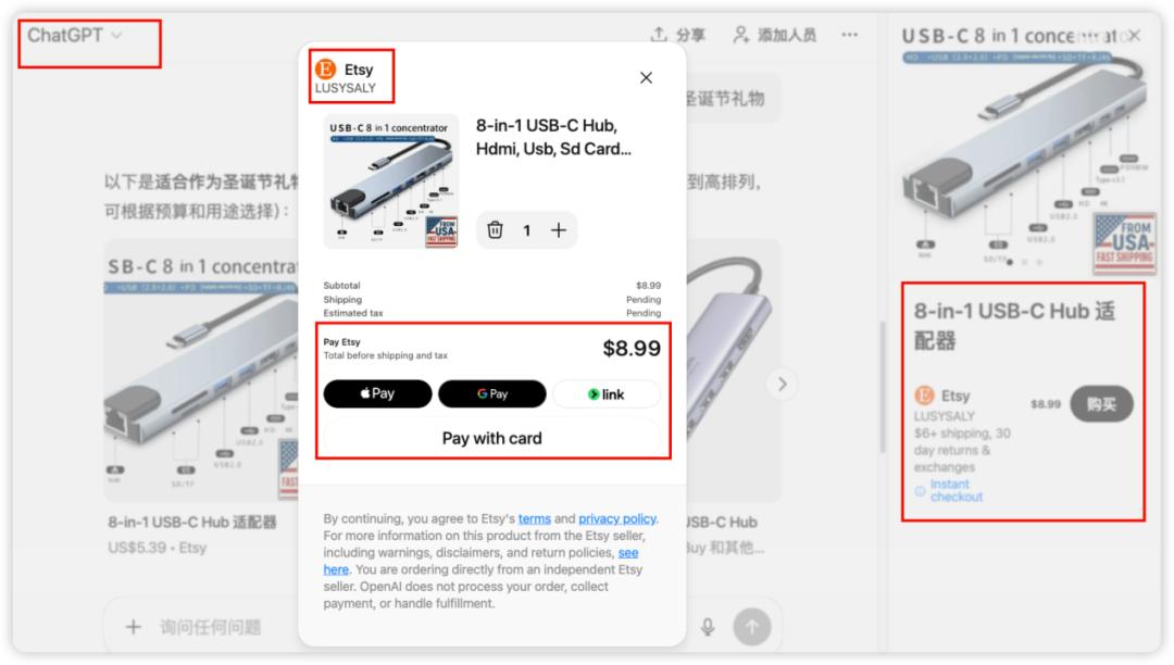 2025年9月底,ChatGPT上线了“即时结账”功能,接入Etsy和 Shopify等平台。