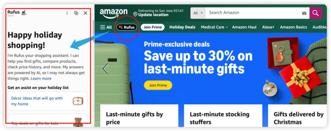 其中,最具代表性的动作,是亚马逊推出的对话式AI购物助手Rufus,该助手被直接嵌入首页搜索框本体,成为用户购物行为的一个新入口。