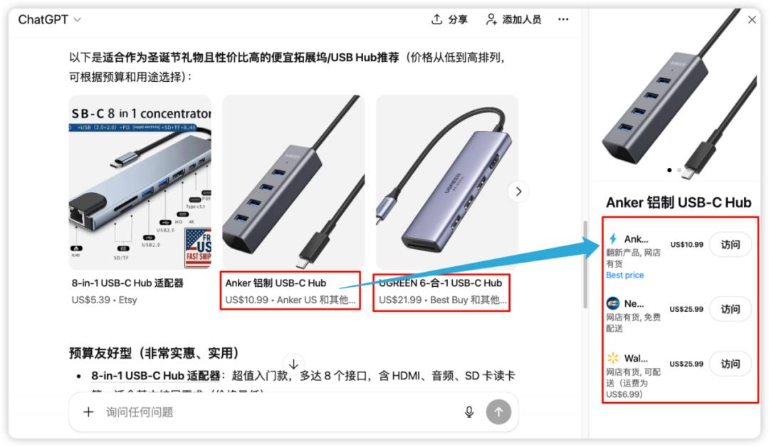 例如,用户在ChatGPT的推荐结果页中,点击一款Etsy的拓展坞,即可在ChatGPT界面内完成下单与支付,而无需跳转到Etsy的商品详情页。