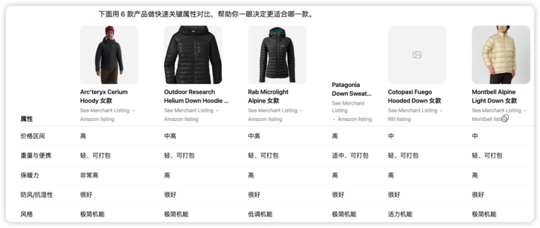 以购买一件羽绒服为例,ChatGPT并不会直接扔出商品链接,而是为用户提供了“更接近线下购物”的体验和流程。