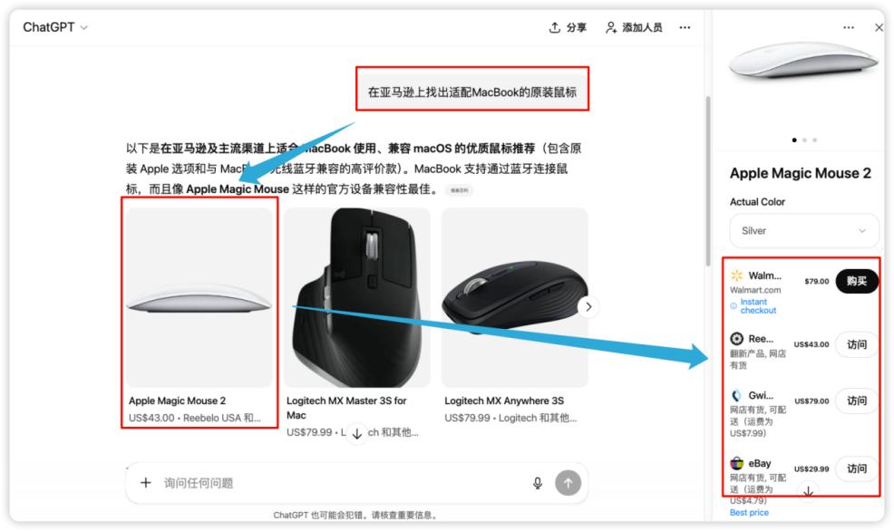 举个例子,用户在ChatGPT上进行购物和搜索时,要求ChatGPT在亚马逊上找出“适配MacBook”的原装鼠标,此时,结果页往往会给出Walmart、eBay等平台的产品链接,而亚马逊的产品链接要么不出现,要么排序靠后。