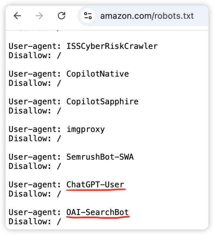 近期,亚马逊在最新的robots.txt文件中,明确屏蔽了两个来自ChatGPT的爬虫:ChatGPT-User和OAI-SearchBot。