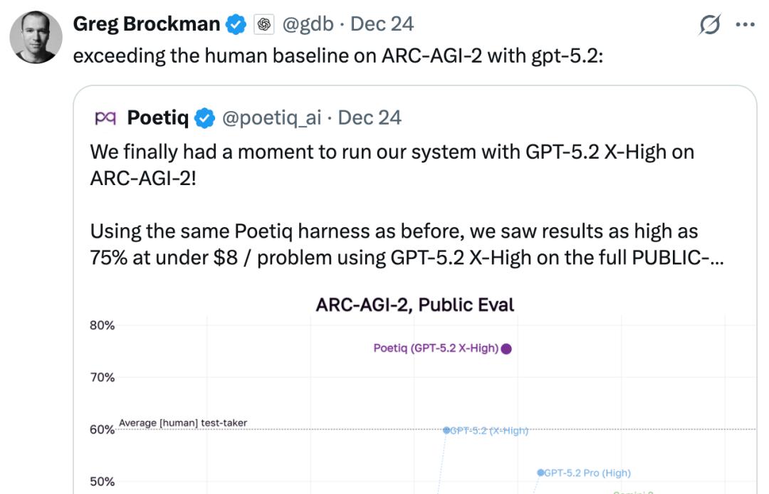 OpenAI 总裁 Greg Brockman 也转推表示:GPT-5.2 在 ARC-AGI-2 上超越人类基准成绩。