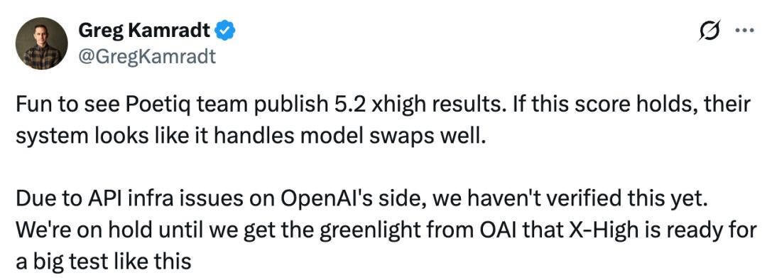 ARC Prize 总裁 Greg Kamradt 表示,「很高兴看到 Poetiq 发布 GPT-5.2 X-High 的结果。如果这个成绩能保持下去,他们的系统看起来能很好地处理模型交换。不过,在 OpenAI API 的基础设施问题解决之前,结果还没有得到完全验证。」
