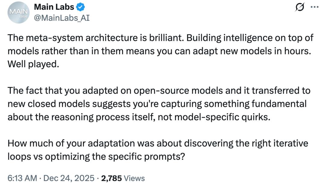 对于这个 meta-system,有人认为「太棒了。在模型之上构建智能,而不是在模型内部构建,意味着可以在几个小时内适配新模型,非常高明。适配开源模型,并且成功迁移到新的封闭模型,这表明捕捉到的东西是推理过程本身的基本规律,而不是模型特定的怪癖。」