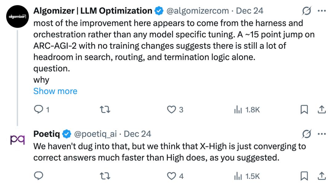 还有人指出「大部分改进似乎来自于测试框架和协调机制,而不是任何模型特定的调优。没有训练变更的情况下,ARC-AGI-2 上提高了大约 15%,这表明仅在搜索、路由和终止逻辑方面就还有很大的提升空间」。