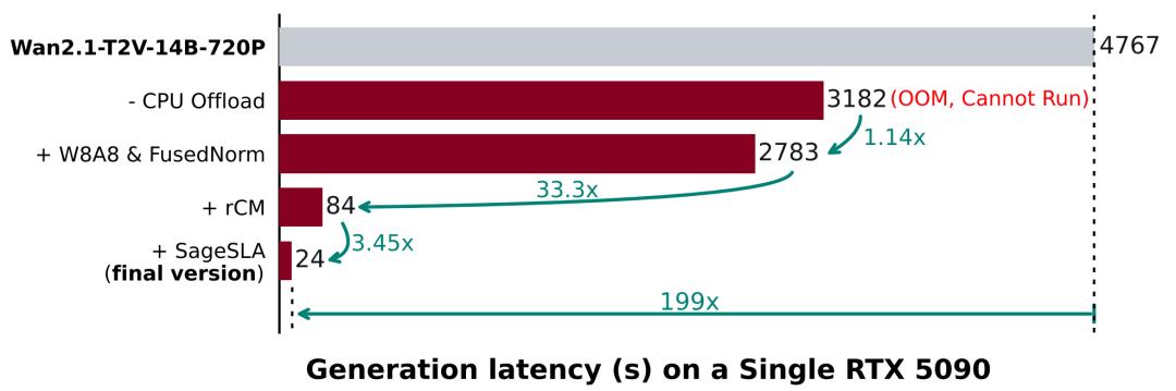 这四项技术环环相扣:蒸馏减步数,量化减负载,SLA和SageAttention减算力。最终汇聚成了那惊人的200倍加速。
