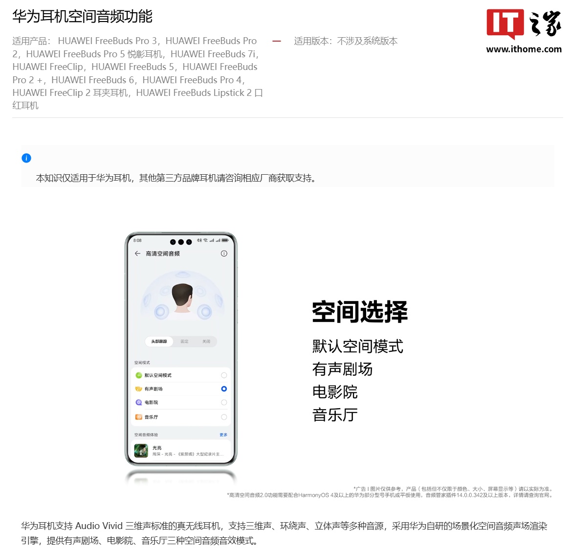 IT之家从华为官网获悉,华为 FreeBuds Pro 5 / 4 / 3 / 2 系列、FreeClip 1 / 2、FreeBuds 7i、FreeBuds 6、FreeBuds 5 等耳机支持 Audio Vivid 三维声标准,采用华为自研的场景化空间音频声场渲染引擎,可提供有声剧场、电影院、音乐厅三种空间音频音效模式。
