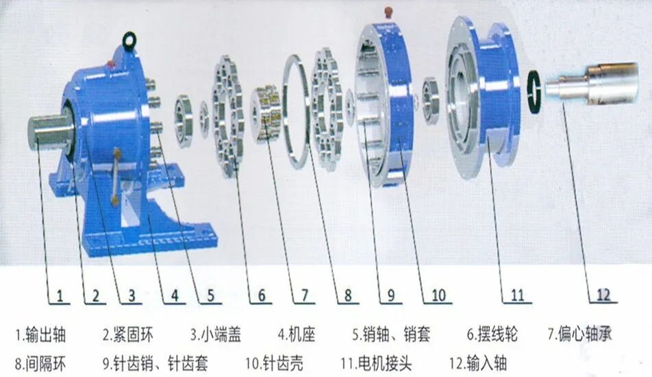 RV减速器是一种复合结构,传动结构分两级,一级是行星齿轮,一级是摆线针轮。摆线针轮减速,通过输入轴带动偏心轴(曲柄轴),使摆线轮在针齿轮内既公转又自转(自转转速即为输出转速),从而实现高传动比。