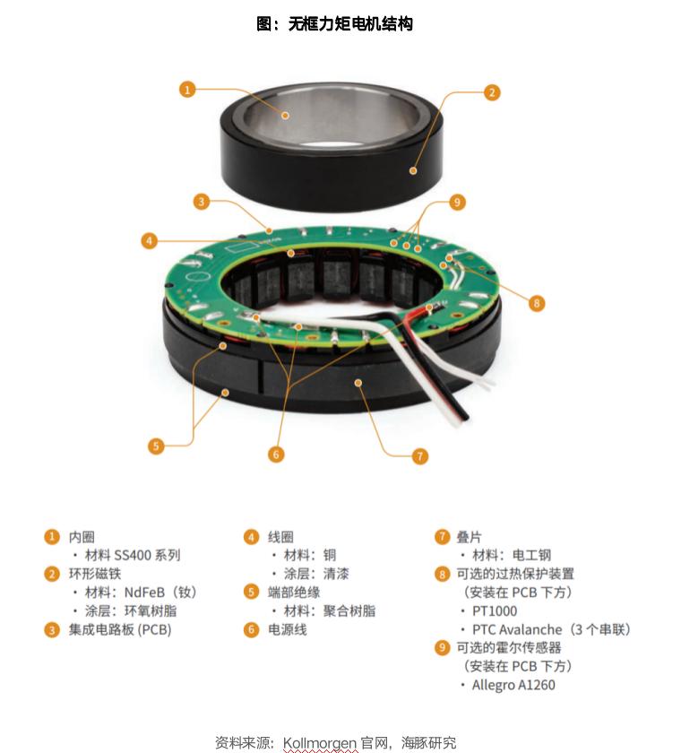 其中,转子由环形磁铁和钢圈组成,可以直接跟关节的主轴集成在一起,定子由叠片和铜线圈等部件组成,可以直接与机器的外壳结合在一起。