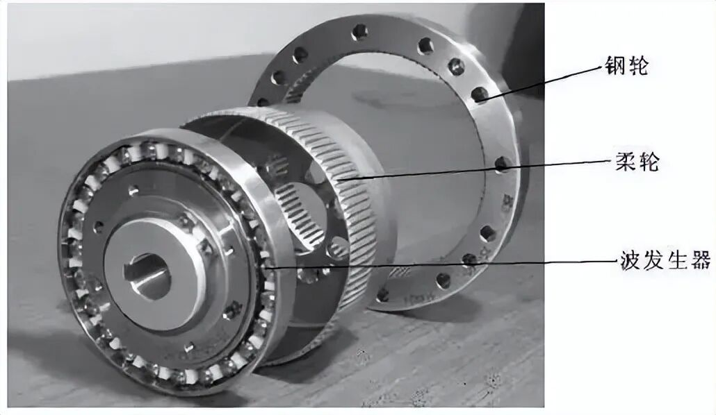 谐波减速器主要由波发生器、柔轮和钢轮组成。波发生器是让柔轮发生弹性形变,然后柔轮齿与外侧的钢轮齿会在不同位置持续发生啮合和分离。这个过程中,柔轮与钢轮的啮合位置会不断发生变化,最终导致柔轮相对于钢轮发生缓慢旋转。