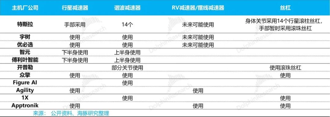 表 主机厂公司身体关节使用减速器和丝杠的情况