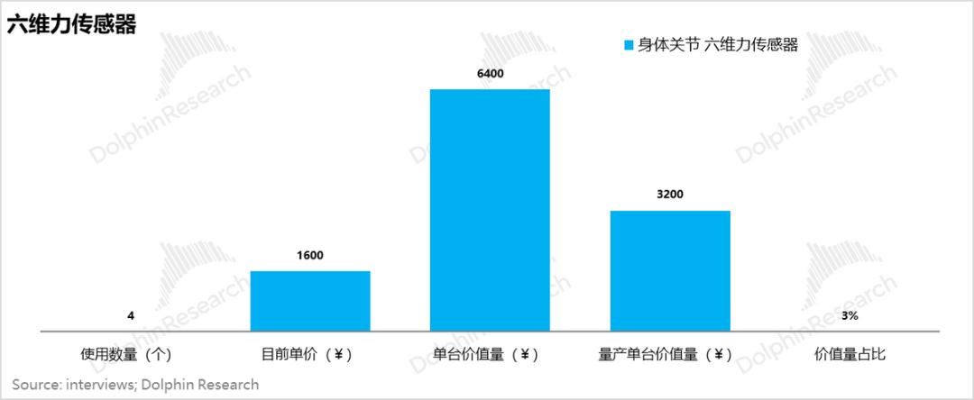 价值量占比不高。根据我们的测算,Optimus需要使用4个六维力传感器,对应目前单台人形机器人价值量在5400元,产业成熟后降本到3200元,在人形机器人当中占比在3%。