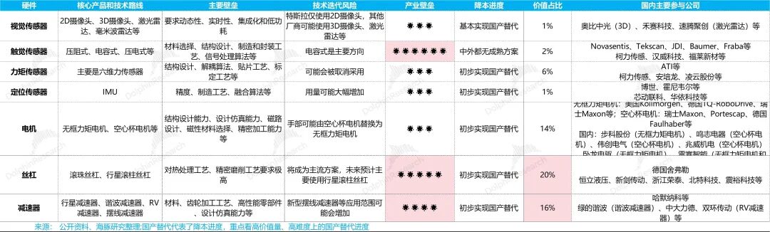 此外,人形机器人并未进入产业化量产的阶段,技术路线并未收敛,以上分析主要基于当前主流技术路线,不排除未来技术路线发生变化,导致新的硬件的出现或者部分硬件被替代。