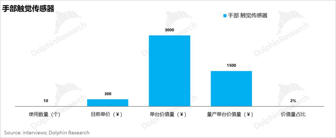 目前价值量占比可能不高,但未来有增加可能性。根据我们的测算,Optimus手部需要使用10个及以上的触觉传感器,对应目前单台人形机器人价值量在3000元,产业成熟后降本到1500元,在整个人形机器人价值量中占比仅2%。