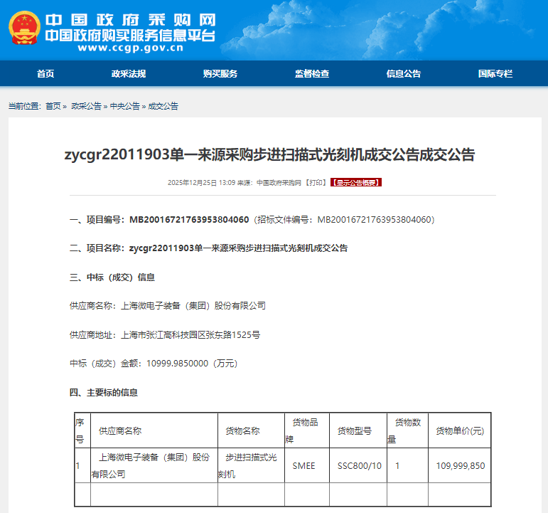 据中国政府采购网公示,上海微电子装备(集团)股份有限公司中标zycgr22011903采购步进扫描式光刻机项目,设备数量为一台,成交金额10999.985万元。