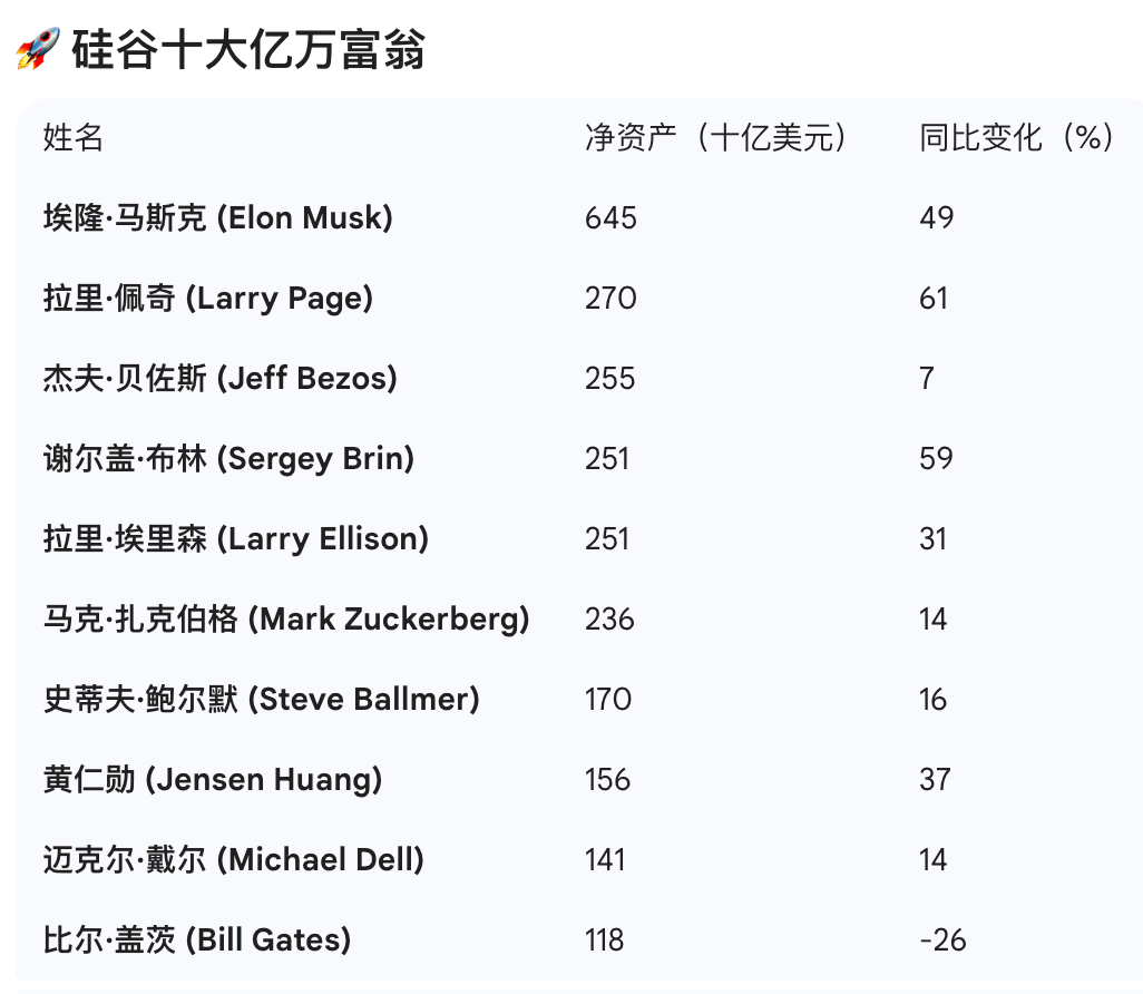 扎克伯格和埃里森的排名被谷歌联合创始人拉里·佩奇(Larry Page)和谢尔盖·布林(Sergey Brin)超越,后二人净资产分别增加了2700亿美元和2550亿美元,这得益于谷歌在自研AI模型和芯片方面取得的进展。