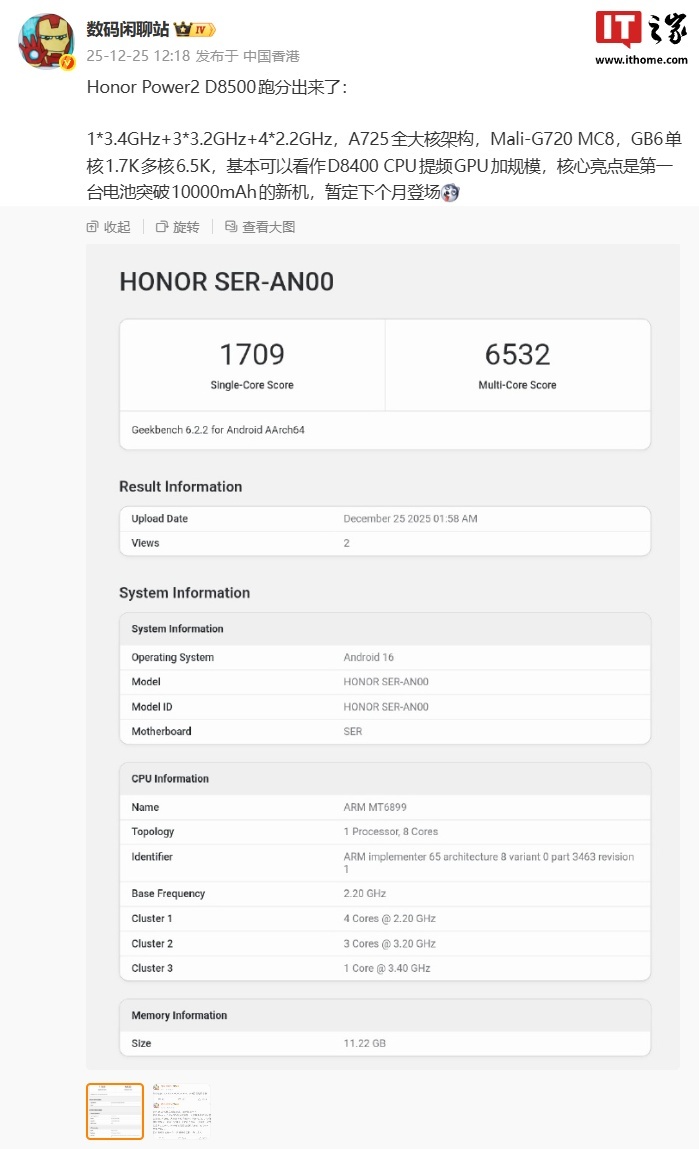 据IT之家稍早些时候报道,型号为 SER-AN00 的新机跑分已公布:单核 1709、多核 6532,消息称该机为荣耀 Power2,搭载“D8500”处理器,核心亮点是第一台电池突破 10000mAh 的新机,暂定下个月登场。