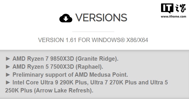 同时,本次更新确认加入多款 AMD 产品,包括锐龙 7 9850X3D、锐龙 5 7500X3D,后者目前已上市,基于 Zen 4 架构打造,采用 6 核心 12 线程设计,配备 96MB L3 缓存,是 Zen 4 X3D 家族中价格最低的一款入门级处理器。