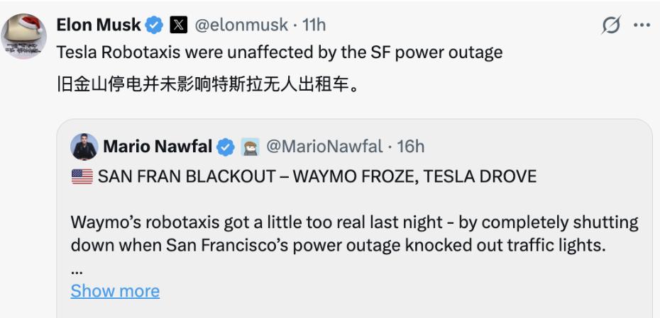 马斯克也直接补刀,称:特斯拉的 Robotaxi,在这次停电中,完全未受影响。