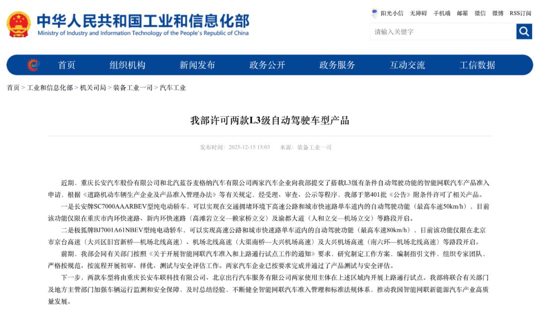 先是北汽新能源和长安汽车,这两家搭载 L3 级有条件自动驾驶功能的智能网联汽车产品,已正式获得工信部准入许可。