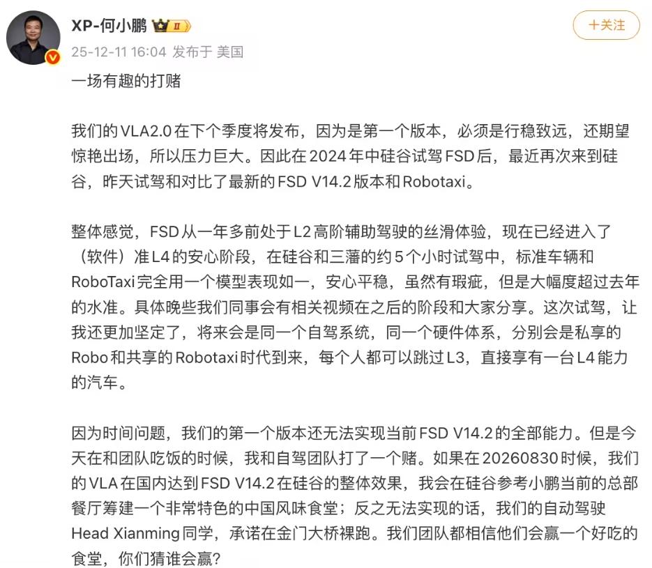 明年小鹏汽车的 VLA2.0,将和特斯拉 FSD V14.2 达到同等水平,如果可以实现,将在硅谷筹建一家中国风味食堂,如果“赌”输了,负责小鹏辅助驾驶的同事将在金门大桥裸跑。