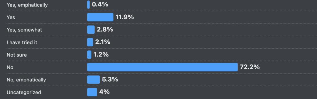 但调研显示,绝大多数开发者(72.2%)并未参与这种非严谨的开发模式,另有5%的人强调这不属于专业工作范畴。