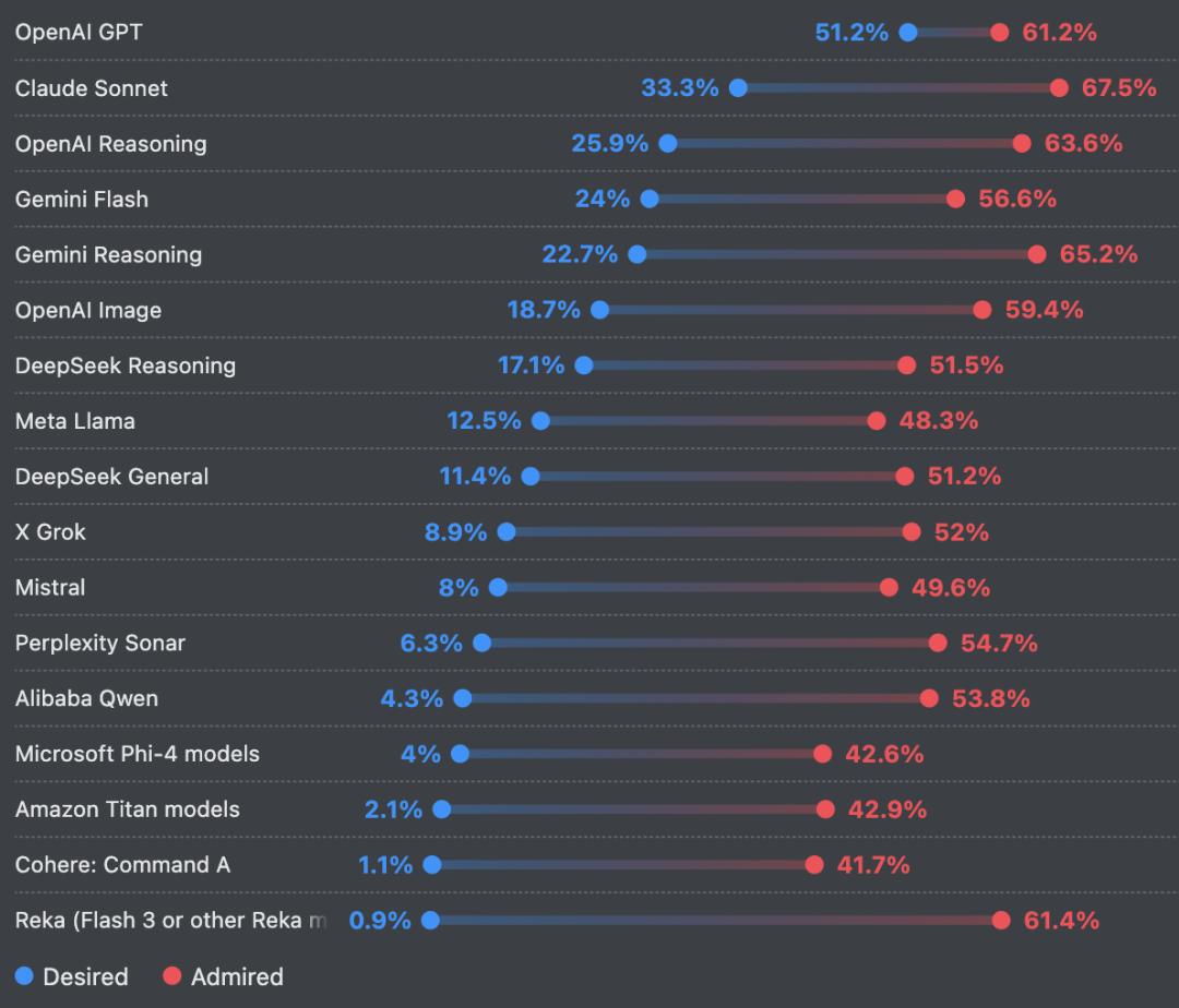 在开发者最喜欢的AI编程大模型的选择上,Anthropic的Claude Sonnet是今年最受推崇的大语言模型,同时在最想尝试使用的模型中排名第二(33%)。