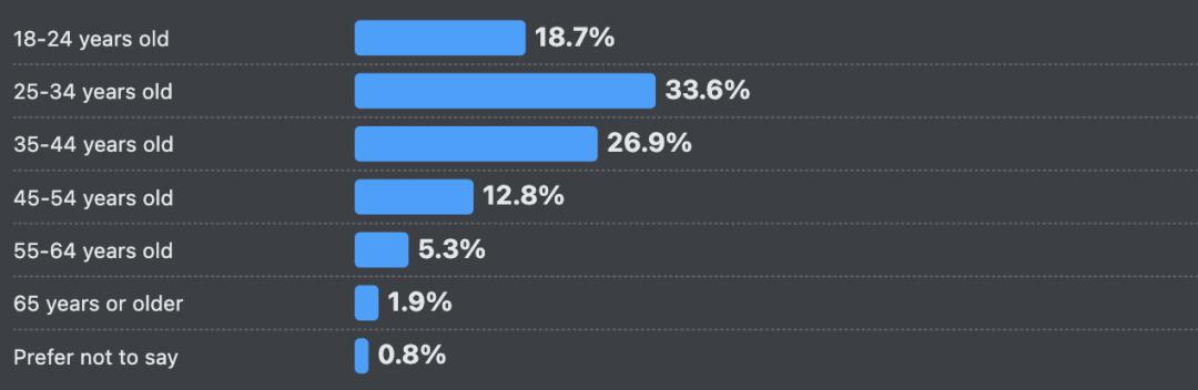 开发者的主力军依然是25至44岁的中坚力量,占比超过60%。