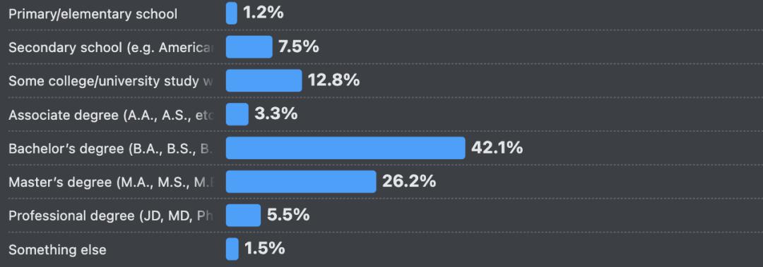 在今年正在学习编程的人群中,已拥有理学学士(BS)学位的比例达到30%,较去年的24%有明显提升。