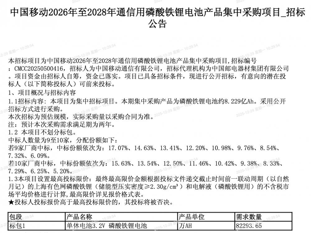 C114讯 12月29日消息(九九)中国移动采购与招标网日前发布中国移动2026年至2028年通信用磷酸铁锂电池产品集中采购项目招标公告,集中采购磷酸铁锂电池约8.229亿Ah。预计本次采购需求满足期为两年。