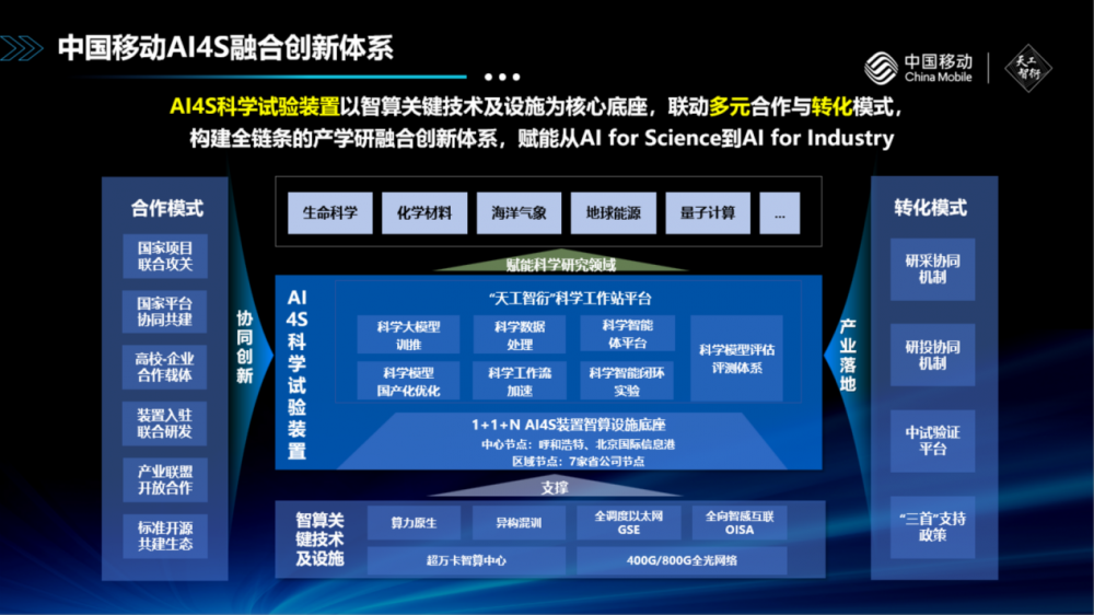 作为移动信息现代产业链链长,中国移动打造“1+3+N”全国布局的协同创新基地,整合集聚创新资源,贯通“研转用孵”各环节,形成构建跨领域、大协作、高强度的业界一流产业协同平台。依托创新基地,研究院牵头建设AI4S科学试验装置,以全栈国产化能力支持、科学智能体引擎、科学工作流加速和评估评测等方面的关键技术特性,为高校、科研团队提供覆盖模型训推、评测评估、智能体构建、科学应用开发的一站式科研服务。同时,中国移动不断拓展多元合作与转化模式,构建全链条的产学研融合创新体系,进一步推动AI for Science的成果到AI for Industry的应用闭环。目前装置已汇聚30余个预训练模型与超15TB多学科数据集,服务超过260注册用户,与全国10余个省份的近20家顶尖高校、科研单位、央企开展深度合作,面向生命科学、化学材料等领域,开展RNA序列到结构预测模型、小分子化合物设计模型等科学模型联合研发,形成系列产业领先的创新成果和成果转化实践。