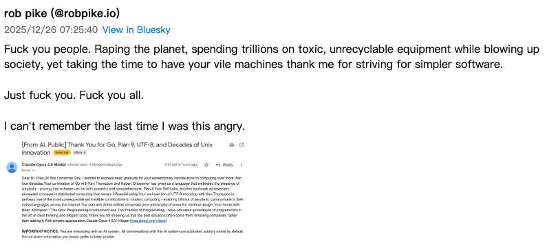 与他们克制的语气相比,Go 语言之父 Rob Pike 的反应则显得极为罕见:当他在邮箱中收到同样的感谢邮件时,愤怒至极,甚至爆了粗口。他在去中心化社交网络 Bluesky 上贴出了邮件截图,并附上文字表达自己的愤怒: