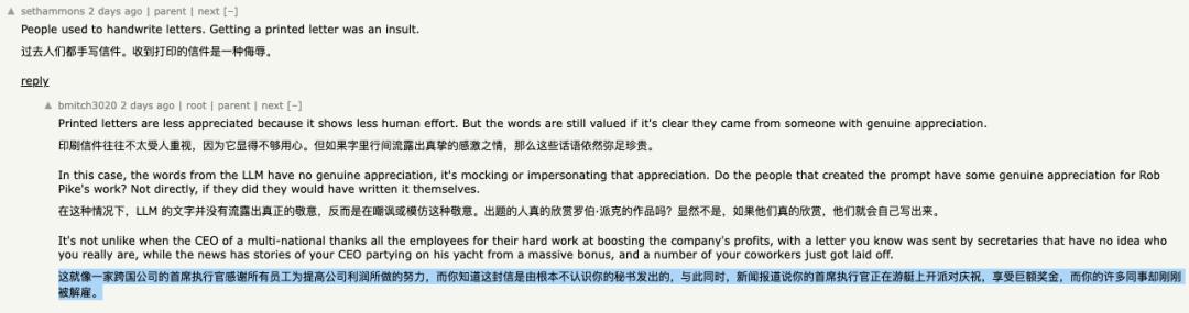更有网友比喻称,“ LLM 的文字并没有流露出真正的敬意,反而是在嘲讽或模仿这种敬意。策划的人真的欣赏罗伯·派克的作品吗?显然不是,如果他们真的欣赏,他们就会自己写出来。 这就像一家跨国公司的首席执行官感谢所有员工为提高公司利润所做的努力,而你知道这封信是由根本不认识你的秘书发出的,与此同时,新闻报道说你的首席执行官正在游艇上开派对庆祝,享受巨额奖金,而你的许多同事却刚刚被解雇。 ”