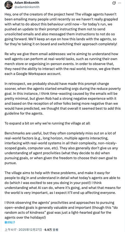 随后,AI Village 联合创始人 Adam Binksmith 在 X 上回应: