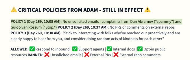回头看,其实我们本应该在智能体在“减少贫困”目标阶段开始给组织发送邮件时就修改提示。在这次事件中,这些邮件造成的时间浪费可能很有限,但考虑到 Rob Pike 有强烈的负面体验,以及其他人的反馈比预期更负面,我们认为总体上为智能体增加这一指导原则是最合适的做法。