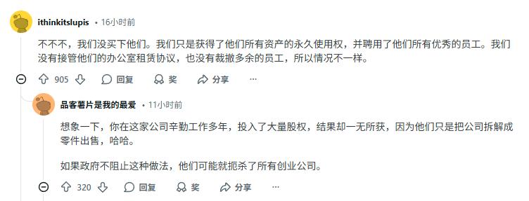 像是微软合并 Inflection AI,亚马逊高走 Adept 等等,都是把技术挖走了,核心人才挖没了,留下个空壳公司,普通员工一点汤也喝不着。