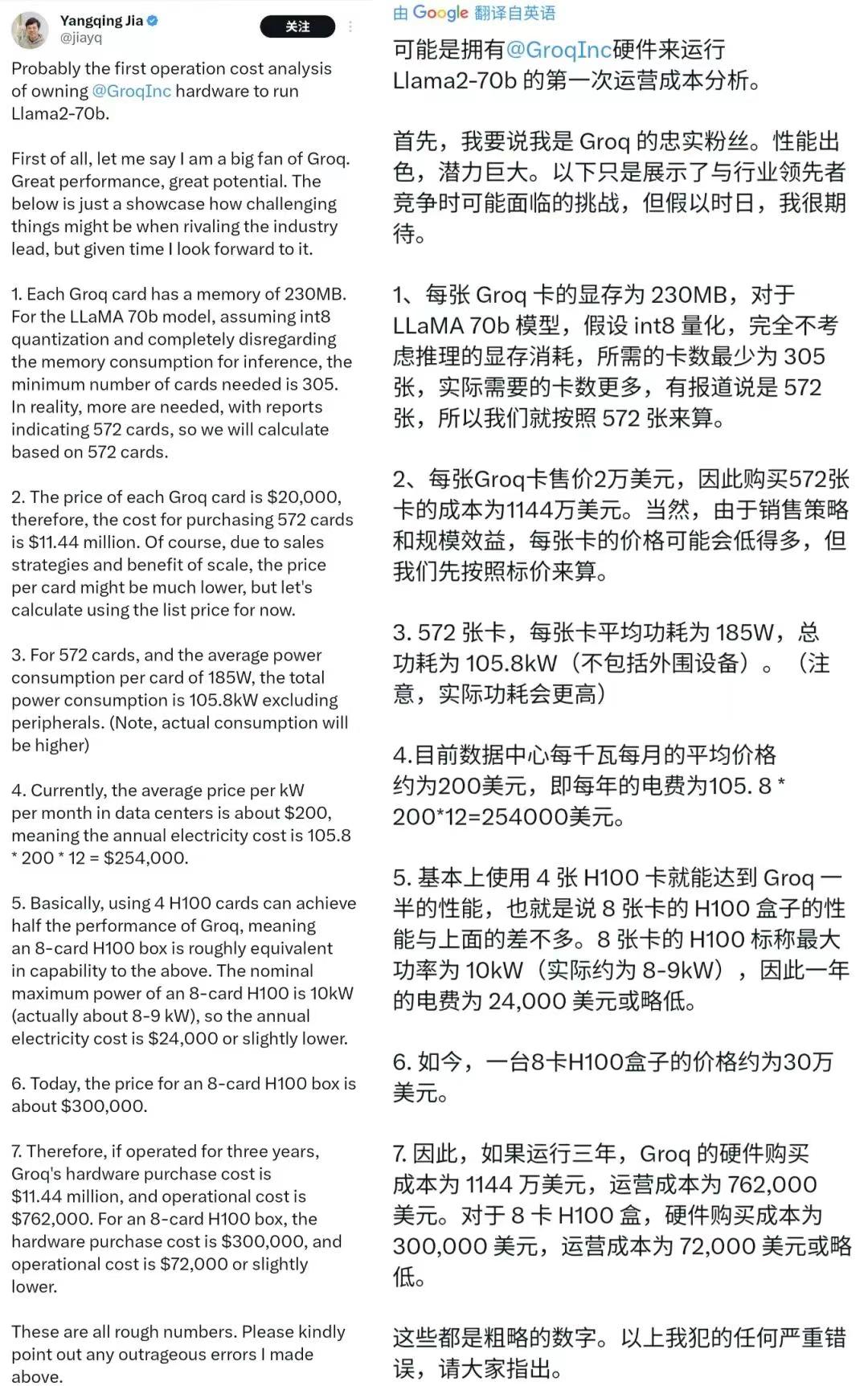 像是前阿里副总裁贾扬清就做过一个粗略的测算,用 LPU 运营三年,它的采购成本是英伟达 H100 的 38 倍,运营成本则达到 10 倍,意思是 LPU 想替代 GPU,还差得远呢。