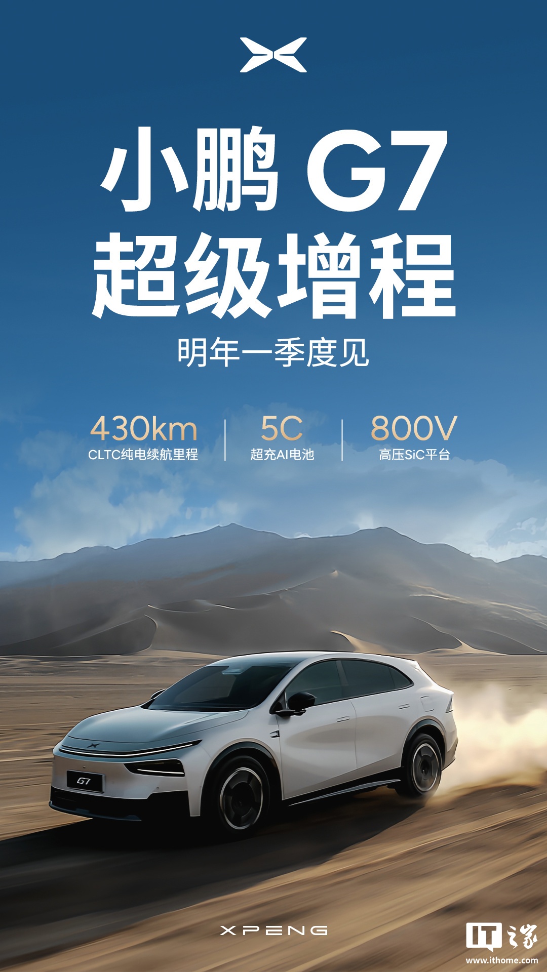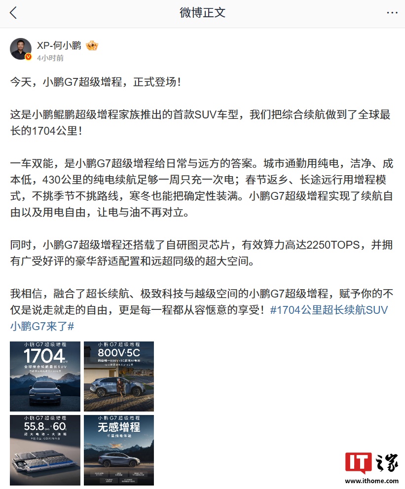 据IT之家此前报道,今年 9 月 12 日,何小鹏在微博发文称,小鹏 G7 超级增程计划于明年第一季度正式跟大家见面。